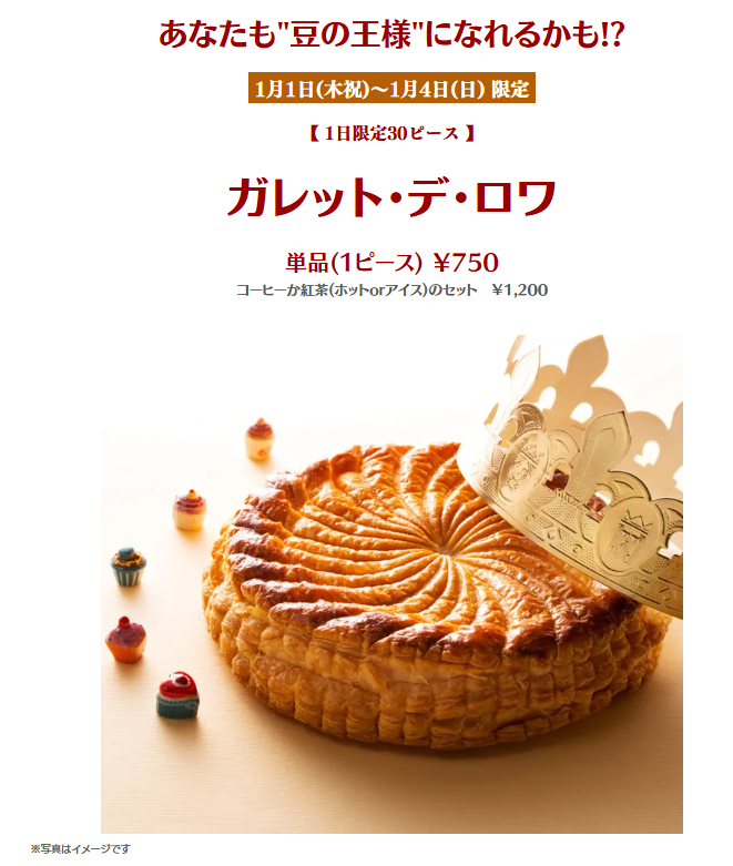 また、1月1日から1月4日までの期間限定で、フランスの新年菓子「ガレット・デ・ロワ」を1日30ピース限定で販売。フランスでは、新年にガレット・デ・ロワを切り分けて食べ、ケーキの中に入っている“当たり”(豆や陶器の人形)を引き当てた人が王冠をかぶり、祝福されるという伝統があります。