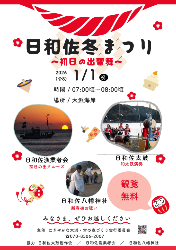 そんな大浜海岸で、元旦には「日和佐冬まつり」が開催されます!日の出とともに和太鼓を演奏し新年を祝う、迫力あるイベントです。他にも「初日の出クルーズ」や「福餅のお裾分け」などのイベントも予定されています。美しい初日の出を拝んで、気持ち新たに2026年を迎えましょう。