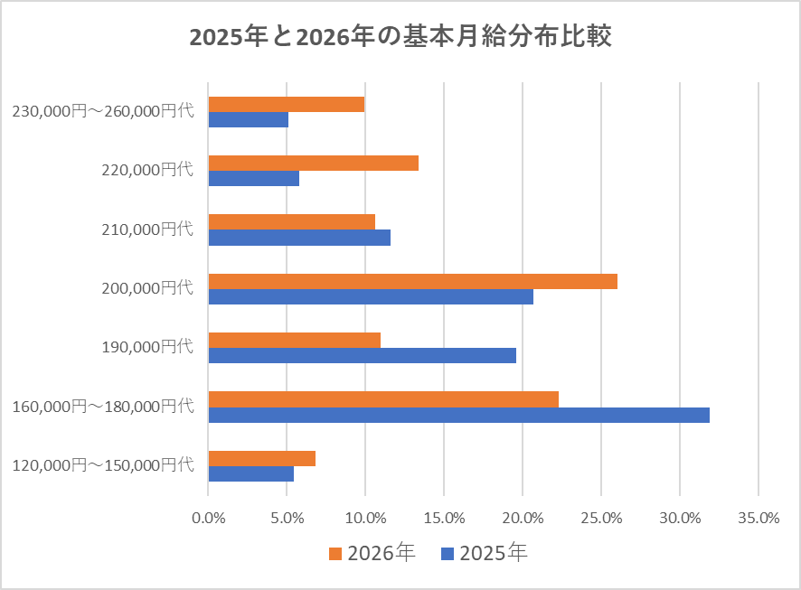 2025年は比較的給与帯が固まっていましたが、2026年は 「20万前半」「23〜26万台」など高額帯が存在感を増しています。