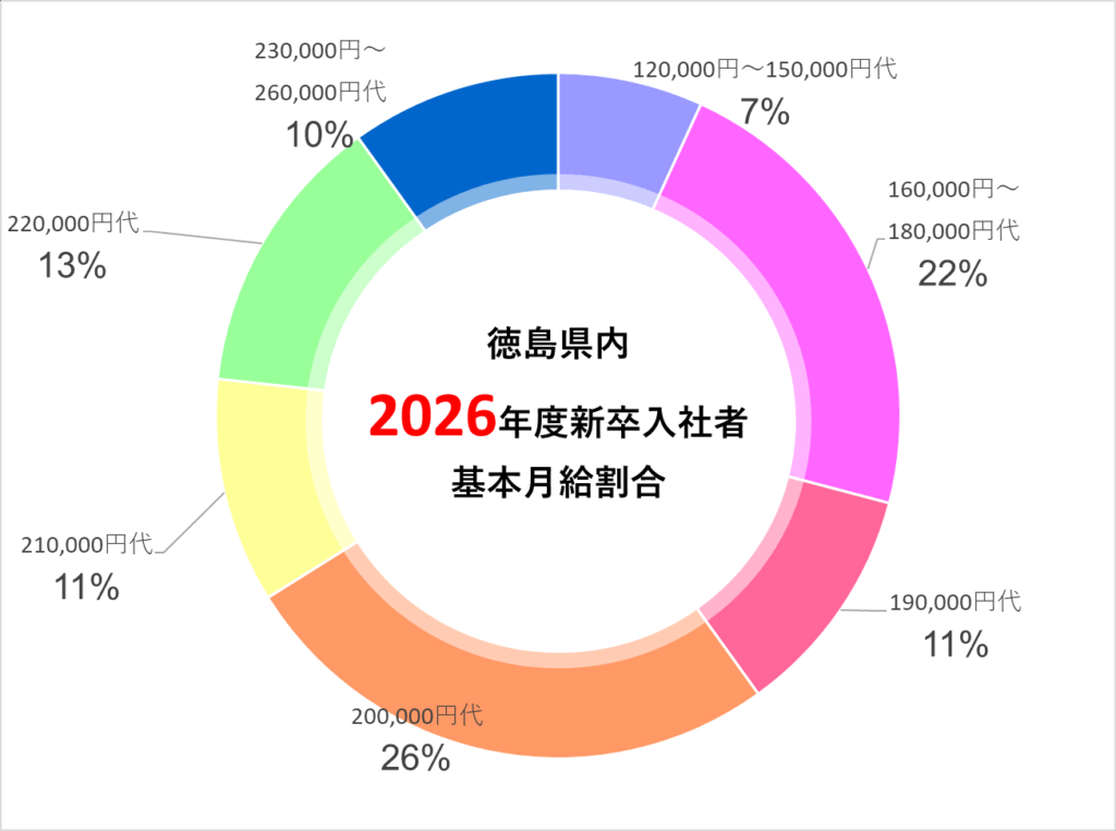 2025年と2026年の徳島県内企業における新卒の基本月給を比べると、県内で“初任給の底上げ”が進んでいることがわかります。もっとも大きな変化は、月給20万円台以上の割合が増えた点です。特に23万~26万円台の高いレンジは、5%から10%へと倍増しました。一方で、これまで最もボリュームが大きかった16万~18万円台は、32%から22%へと10ポイント減少しています。かつて多かった「16万~18万円台の企業」が、2026年には20万円台へ移行している状況です。19万~21万円台の中間層でも、上限側に引き上げる動きが目立ち、給与分布そのものが上のレンジへと押し上げられています。
