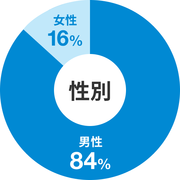 男性が84%と非常に多く女性が少ない環境です。全国的に見ても、男性が81%という割合で、男性が多い職場でもあります。数年前はITエンジニアの働き方は特に熾烈だったこともあり、女性が働く環境としては厳しいものもあったのかもしれません。