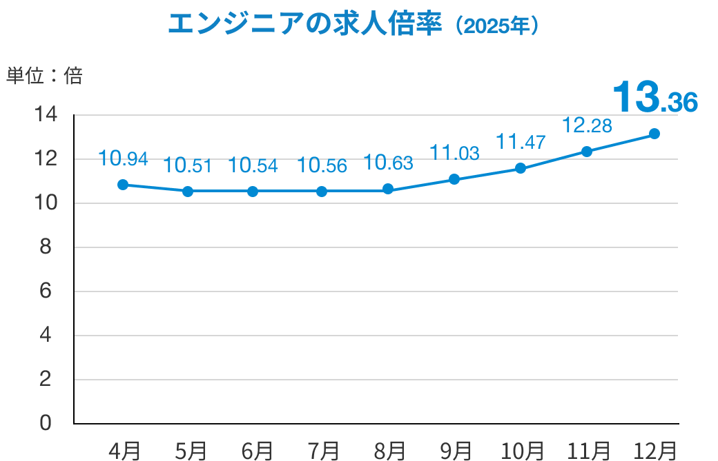 2025年12月のエンジニアの求人倍率は13.36倍。つまり、1名のITエンジニアを13社が取り合っているという状況になります。全職種での求人倍率は2.18倍ですので、極めて高い水準で推移していることが分かります。IT業界で人手不足というニュースは見たことがある人もいるかと思いますが、IT人材の争奪戦となっています。